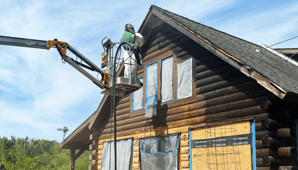 Our gentle sandblasting removes stain and weathering from log homes without damaging the wood for refinishing.